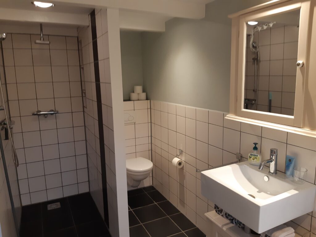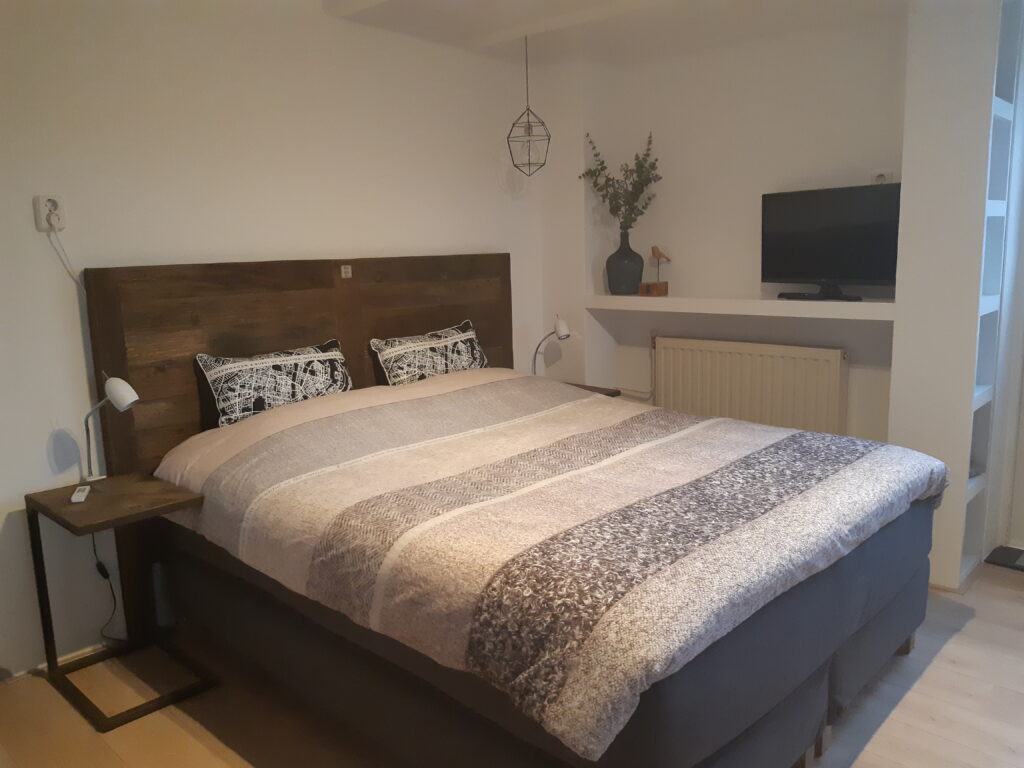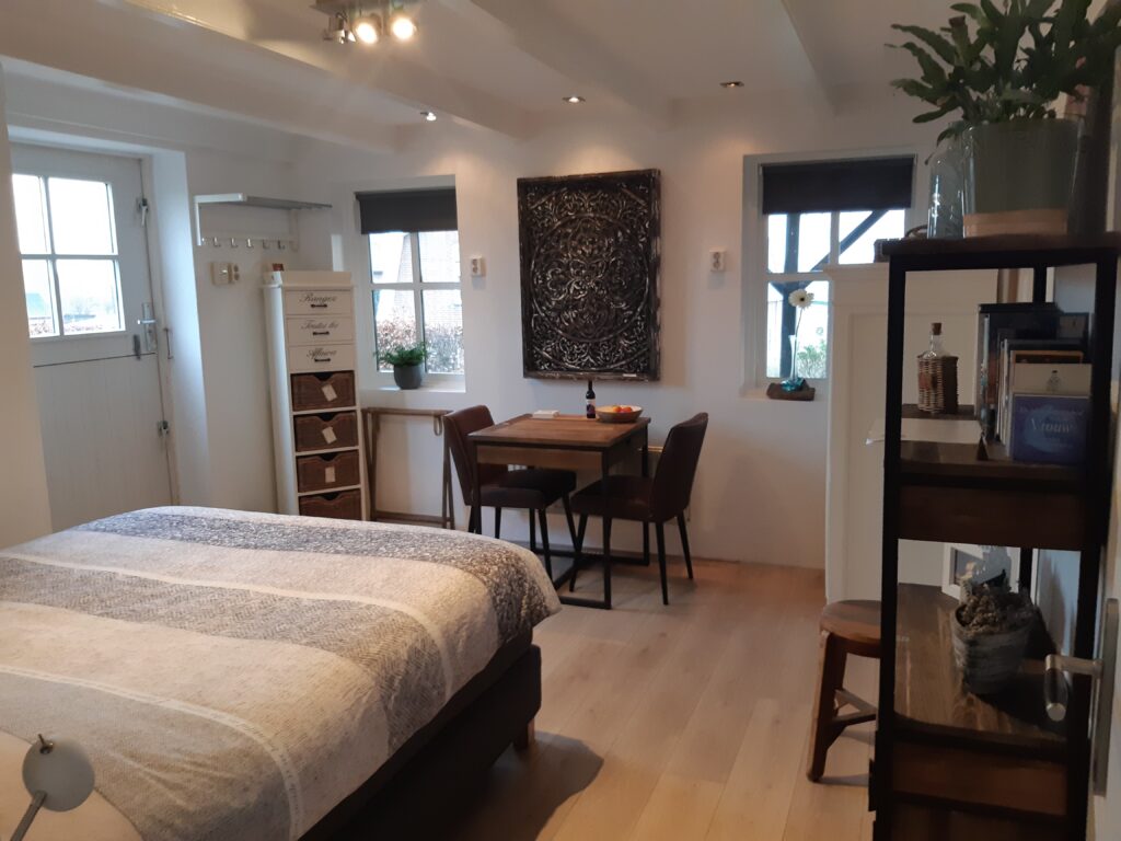 De sfeervolle gastenkamer is ingericht met een eettafel met twee comfortabele stoelen. Tevens staat hier een twee-persoons luxe box-springbed en er zijn voldoende opbergmogelijkheden. Vanuit de gastenkamer bereikt u uw eigen keukentje en de privé badkamer met ligbad en inloopdouche.